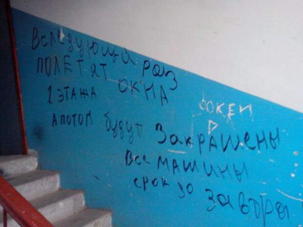 Стоит отметить, что отечественные коллекторы не ушли слишком далеко от своих китайских коллег. В подъездах некоторых домов можно наблюдать не менее неприятные вещи.