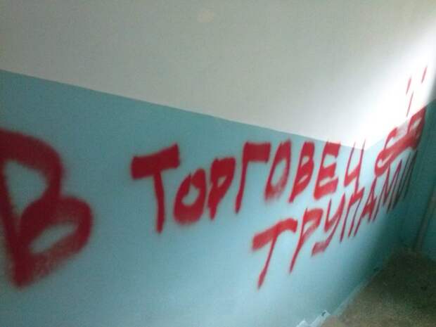 На стене красной краской (будем надеяться, что краской…) оставлена надпись: «Первый этаж, А, верни деньги».