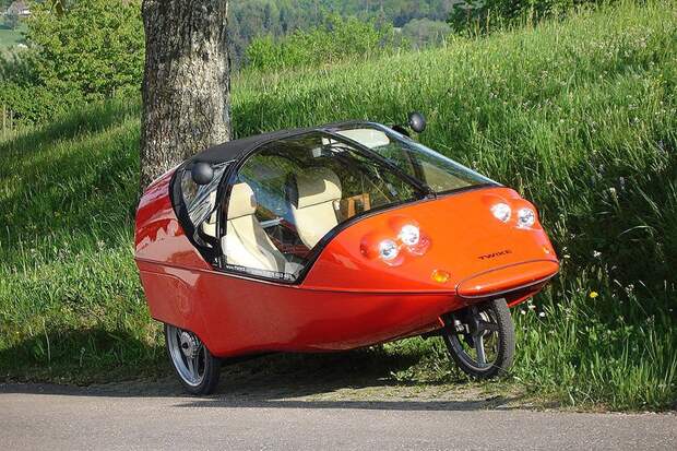 57. Twike (составное от «twin» — двойной и «bike» — велосипед) — гибридный автомобиль, который может двигаться либо благодаря электромотору, либо — человеку.