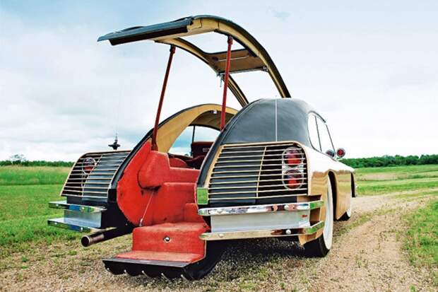 9. Основная особенность машины — отсутствие дверей: внутрь можно было попасть через багажник. Он открывался, выбрасывая вниз ступеньку и встречая пассажира или водителя красной ковровой дорожкой.