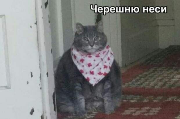 Еще в 2017 году в интернете появился первый мем, частично посвященный черешне (в основном коту). На картинке изображен уже всем известный толстый кот в слюнявчике, а рядом красуется подпись «черешню неси». Кот при этом выглядит так, будто уже съел ведро черешни, но много этой ягоды, похоже, не бывает.