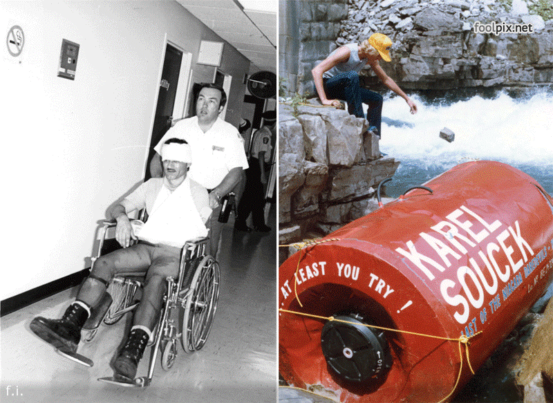 Карел Соучек проходит через Ниагарский водопад в бочке. Происходит всё это безумие в 1984 году. Он сам сконструировал приспособление и решил таким образом увековечить свое имя в истории. Но перехода через Ниагару для Соучека было недостаточно. Он решил использовать эту же конструкцию, чтобы сброситься с высокой башни в Хьюстоне. Соучека сбросили с высоты 55 метров в сконструированной им бочке, в ней он должен был приземлиться в бассейн внизу. Но бочка двигалась слишком быстро, и Соучек приземлился на край бассейна. Карел скончался мгновенно.