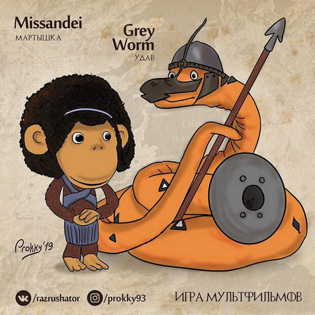 Предложение из комментариев показалось крайне удачным: действительно Удав отлично справляется с ролью безупречного Серого Червя (хотя бы за счет формы тела), а роль его возлюбленной Миссандеи играет Мартышка.