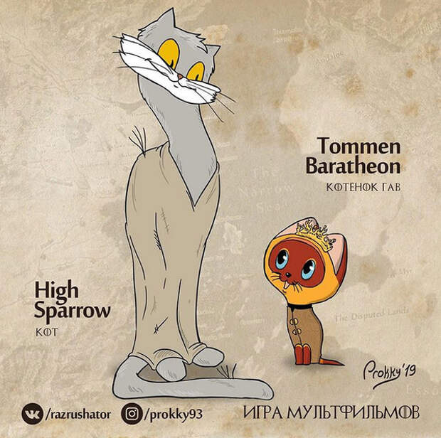 Малыш Томмен, неожиданно для себя ставший королем, очень быстро попал под влияние разных сомнительных личностей, в том числе Его Воробейшества. Прямо как Котенок Гав во всем беспрекословно следовал примеру уличного Кота.