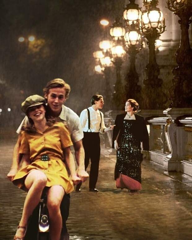 Например, на этом изображении он объединил героев фильма «Дневник памяти» и «Титаника».