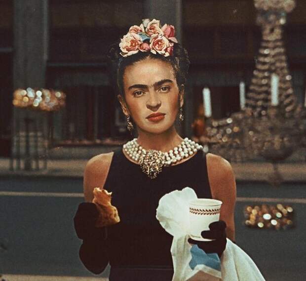 К примеру, на этом фото он «угостил» Фриду Кало круассаном и кофе.