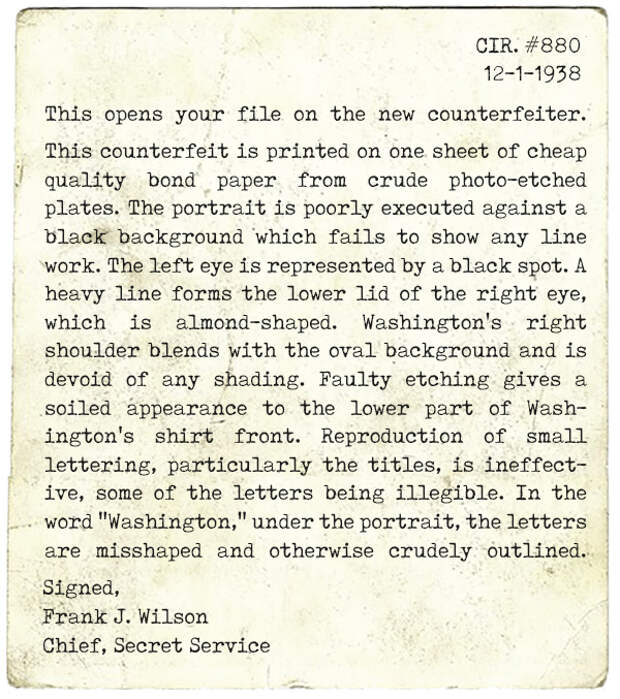 Но рано или поздно власти должны были узнать о появлении на рынке подделок. Когда в Секретную службу министерства финансов (ССМФ) принесли первые фальшивые купюры, агенты не поверили своим глазам. Во-первых, ни один уважающий себя преступник не будет изготавливать купюры в 1 доллар, так как себестоимость их изготовления высока, а навар очень мал.