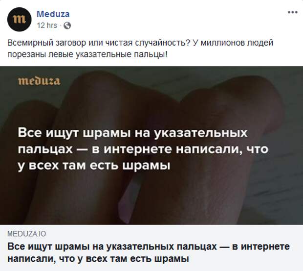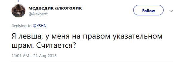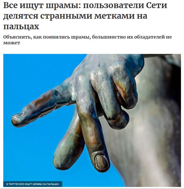 Из-за призыва в Твиттере, мужчины внезапно осознали, что у каждого из них есть шрам на указательном пальце. Но девушкам есть что на это возразить. Пользователи Рунета с подачи журналиста Олега Кашина неожиданно увлеклись сетевым флешмобом про обязательный шрам на указательном пальце левой руки. А правда, что у всех мужчин на левом указательном пальце есть шрам?