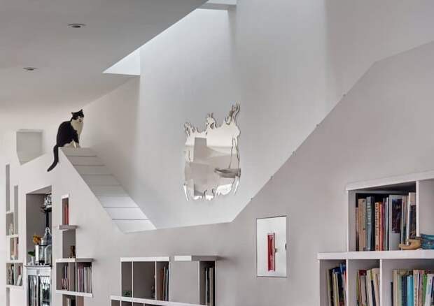 Счастливые обитатели просторного трехэтажного дома всегда мечтали о светлом и необычном интерьере, в котором вольготно разместилась бы их обширная домашняя библиотека и коллекция произведений искусства, а две любознательные, но пугливые кошки могли бы с легкостью сбежать от нежданных гостей.