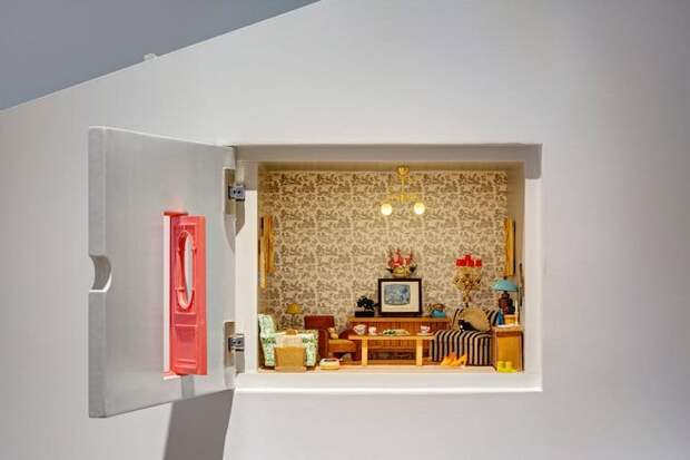 В стенах расположены удобные полки для хранения. В одной из них находится диорама, изображающая крошечную копию хозяйской гостиной.