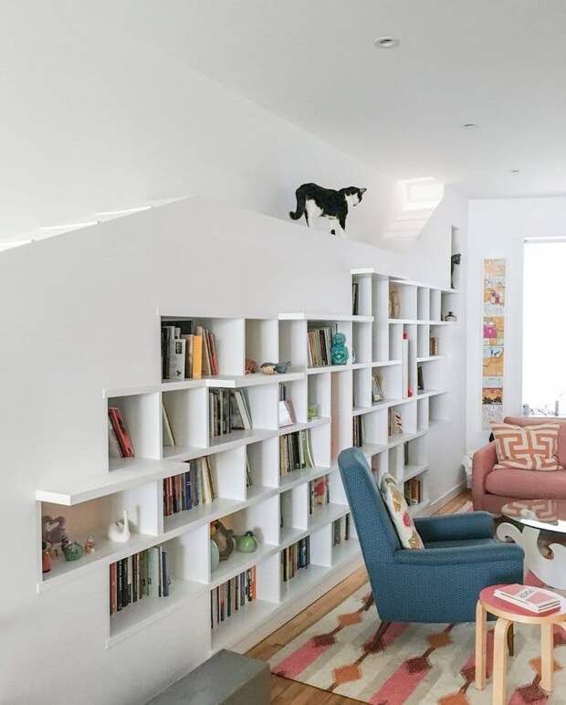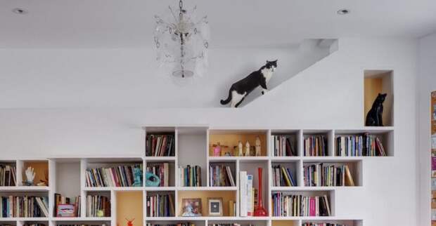 Так родилась идея стеллажа для книг со множеством полок, растянутого по всей стене. Изготовленная на заказ конструкция была спроектирована таким образом, чтобы кошки легко могли забраться на самый верх.