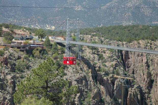 56. Этот мост пересекает пропасть Ройал-Гордж на высоте 304 м, что делает его самым высоким мостом в США. Лишь немногие смельчаки отваживаются пересечь пропасть по мосту, не говоря уже о канатной дороге.